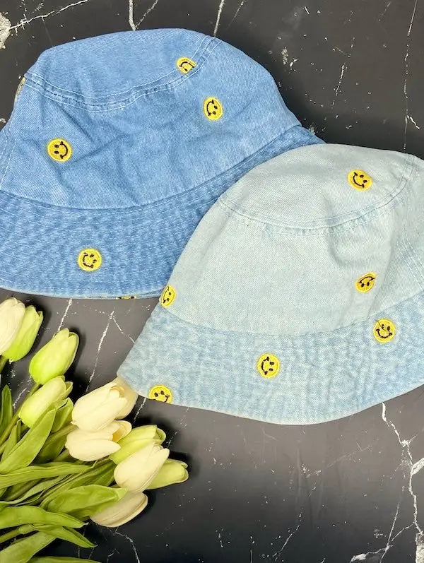 The 90's are back baby! And we have the buckets to prove it! These adorable denim hats are one size fits most (with an internal ribbon for sizing) and are scattered with the perfect amount of tiny smiley faces.